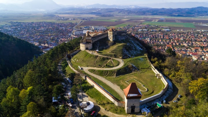 Rasanov Castle, or Fortress, perches atop a rocky hill in the Carpathian Mountains. It was built by the Teutonic Knights. The castle features a mix of Gothic and Renaissance architectural styles. Inside the fortress there is a museum that briefly presents elements of local history and the area's habits and crafts and also gathers artifacts and weapons. It contains the following sections: document photocopies, weapons, tools, stamps, and period objects