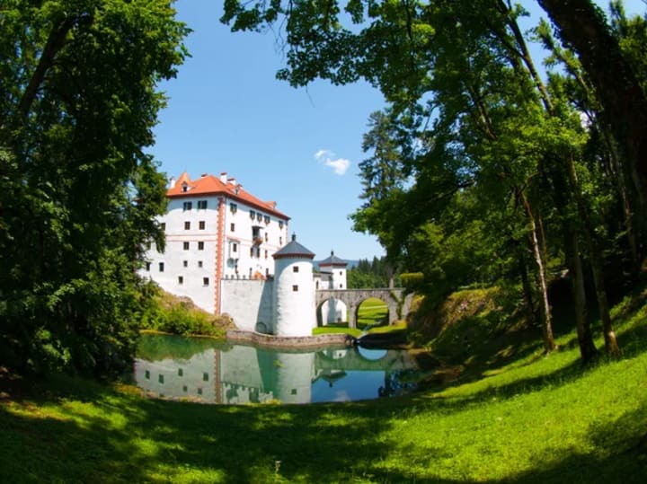 Otocec Castle (pictured above) sits on an island in the middle of the Krka River. It is known as the only water castle in Slovenia. Otočec is located near the town of Novo Mesto in southeastern Slovenia.
