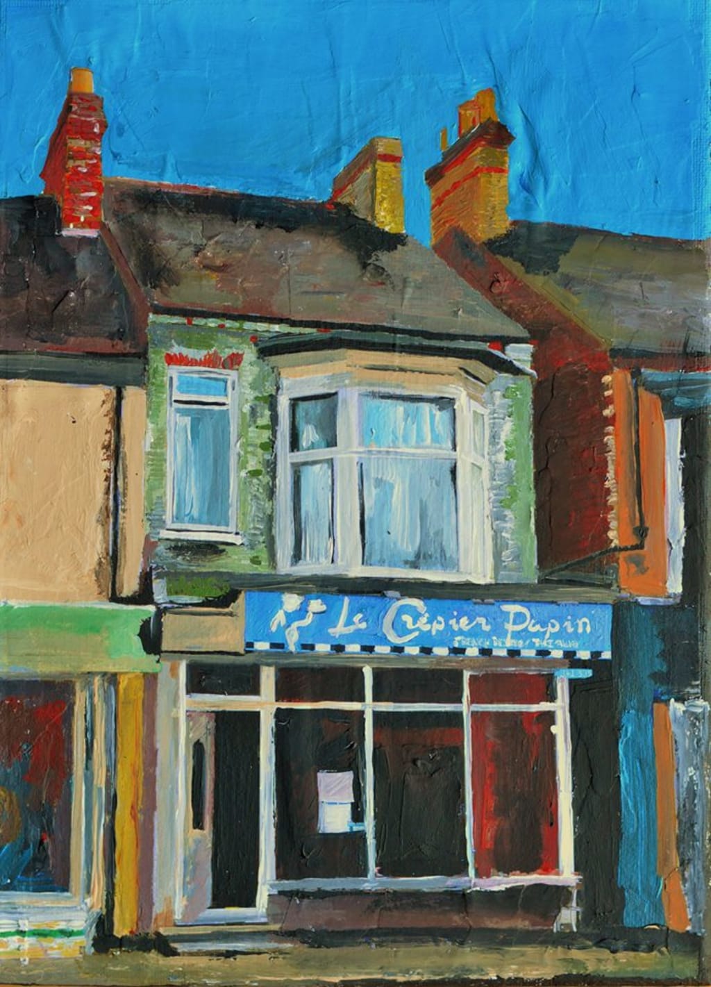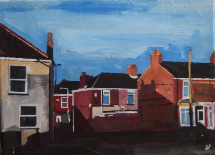 One special road is Ella Street, the so-called street of Birds and Shadows. Gems of red brick and small alleys where cats prowl and mice cower. A few minutes’ walk, but a world away, is Grafton Street, punctuated by its flat roofed pub, known locally as the Bin. I was delighted and surprised to wander in there one day to discover t-shirts printed with my artwork. Grafton Street leads to Beverley Road, and feels edgier, the fringe of Bohemia perhaps but no longer its epicentre. Front gardens where damp mattresses rot, front doors of peeling wood and rotting plywood.