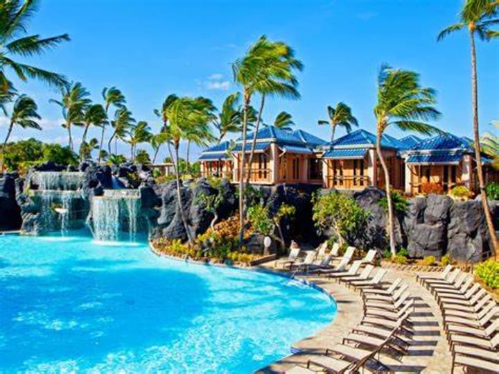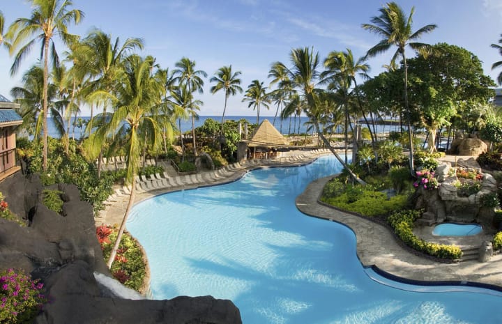 Waikoloa Beach is located on the Kona Coast and is in an area with many petroglyphs. Tourist vacation in the Hilton Waikoloa Village. Here visitors can enjoy cruising the canals in wood-paneled boats.
