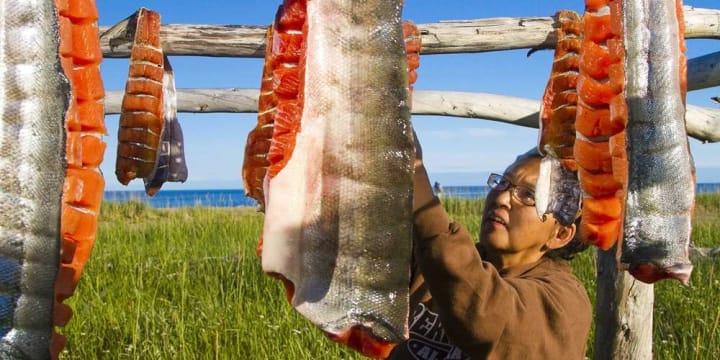 Alaska has over 10,000 years of human history, and about 15% of Alaska’s population is an Alaskan Native. The Unangax and Sugpiaq tribes depend on the sea for survival. They live in semi-subterranean houses made with wooden or whale bone rafters. Their hunting attire were designed to honor animal spirits. Athabascans were a migratory Native tribe that follows fish and game migrations across Alaska, and they relied heavily on trade, such as trading of canoes, sleds, dogs, and clothing. Other Native tribes in Alaska include Iñupiaq, St. Lawrence Island Yupik, Tlingit, Haida, Eyak, Tsimshian, Yup’ik, and Cup’ik. Each tribe relies on migratory animals, such as fish and whales, to rely on food and living conditions.