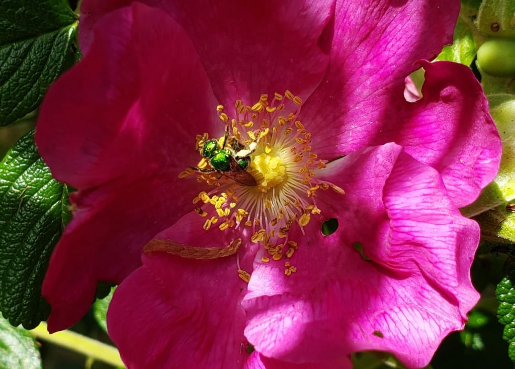 The trance state came on quickly and I found myself watching the zigzag path of a small, brilliant green bee. I followed it until it landed on a bright pink rose where I watched it as it snuffled around in the pollen, dusting its head and legs with yellow. When I looked up again I found myself on a crushed stone path in a garden. As I turned and walked along the path I noticed that it led to a circle of the same crushed stone that wrapped around a central circle of rose bushes with three other paths like the one I was on leading out from the center. In the middle of the central circle of roses was a huge quartz crystal cluster. The bushes were well tended and in full bloom with vibrant colors ranging from snowy white through many hues of yellow, orange pink and red to deep, dark purple and the scent was amazing. Outside the main circle there were also rose bushes with other flowers and shrubs intermingled. Insects buzzed and whirled lazily around the blooms and cast off brief flashes of color as the sun hit the wings of butterflies and the flashy metallic carapaces of beetles and colorful bees. There were also two stone benches diagonally across from each other on the round path. Seated on the one farthest from me was Joan G. She was a channel (remember it was the 80’s) who had given various classes and workshops on developing intuitive and healing abilities which I’d attended, and the owner of a communal farm in Washington State where I planned to visit in a few days for one of her workshops. I walked over and sat next to her and we discussed Universal connections and plans which I really didn’t, and still don’t, remember though I have the feeling that those plans and connections are still with me.