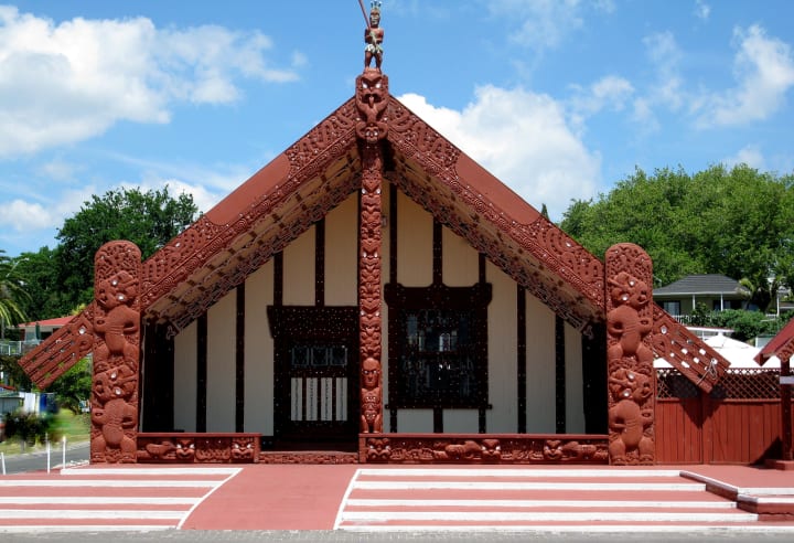 Across the lawn, you can see the meeting house that was completed in 1940. Fine carvings represent the major Maori tribes. Near the cove, visitors can see the 35m war canoe.