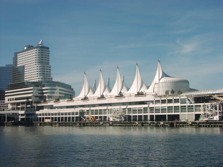 Canada Place is where you would be if you arrived in Vancouver on a cruise ship. The unusual roof design gives the impression of a huge sailing vessel. The structure is part cruise ship terminal, part convention center, and hotel, and part hub for sightseeing bus tours.