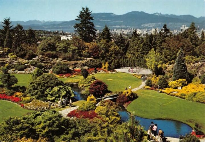 Stanley Park is adjacent to Downtown Vancouver and is a peninsula with huge trees. The green space is encircled by a paved seawall path which is a great place for strolling or biking. There are lovely blooming cherry trees in the spring and rhododendrons. In the summer people enjoy the heated outdoor pool right by the edge of the ocean.