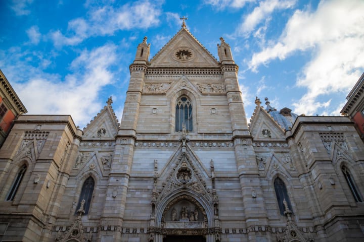 Visit the impressive Naples Cathedral initiated by Charles I of Anjou in 1272 and consecrated in 1315. There was a lot of damage done to the cathedral in an earthquake in 1436. A neo-Gothic facade was added in the late 19th century. Inside you’ll see the gilded coffered ceiling in the central nave studded with late-Mannerist art. The high sections of the nave and the transept are the artwork of Baroque artist Luca Giordano.