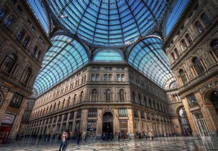 Galleria Umberto I was named for Umberto I, then King of Italy. It has been designed as a public place for shopping, businesses, cafes, and social space. This tall building has four wings with iron and glass vaulting converging at the center under a glass dome.