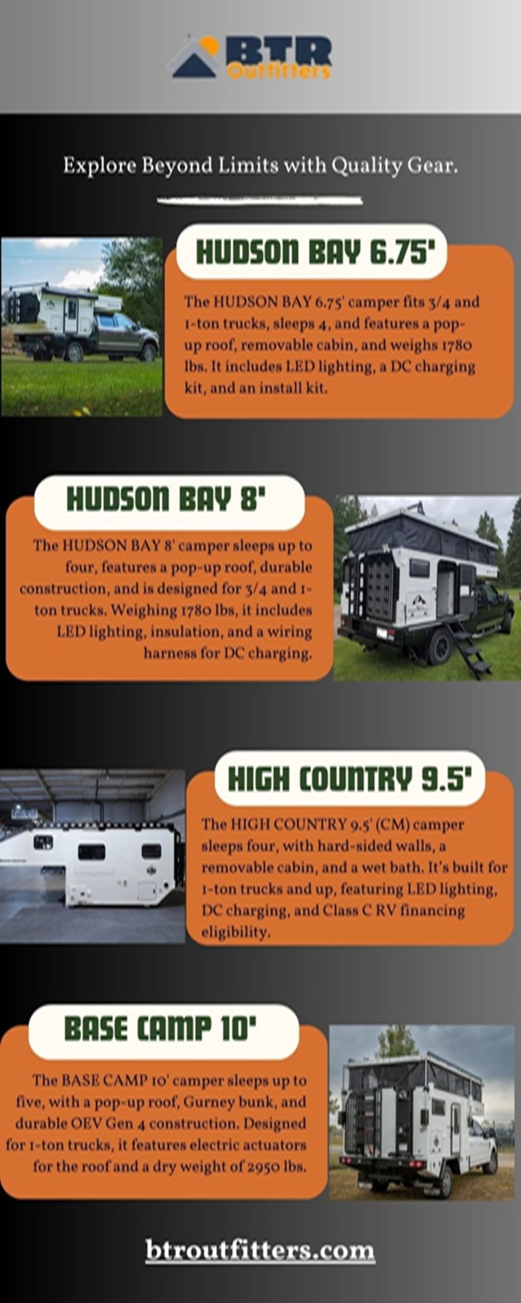 If you’re passionate about outdoor exploration and off-grid adventures, having a reliable and well-equipped camper is key. At BTR Outfitters, their lineup of rugged and versatile campers is designed to fit a variety of trucks and lifestyles. Whether you’re a weekend warrior or full-time traveler, these high-performance campers deliver comfort, durability, and freedom on the road.