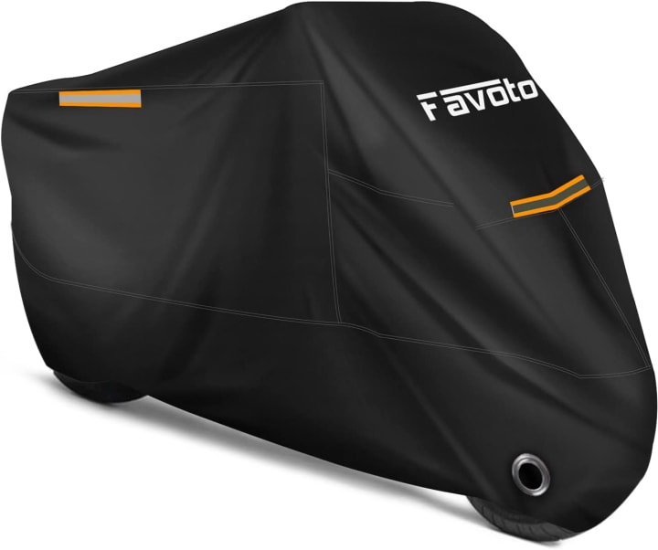 2. The Favoto Motorcycle Cover is an all-season, high-quality accessory that is designed to protect your motorcycle from the elements. With its universal fit, it can be used on a wide range of motorcycles, up to 96.5 inches in length. Made from premium polyester fabrics and with a silver coating on the inside, this cover offers reliable protection from the sun, rain, and other weather conditions. The lock-hole design, which includes two lock-holes for anti-theft protection, makes it easy to secure your motorcycle when not in use. Additionally, the cover comes with three reflective stripes, one on the front and two on the sides, to help you find your motorcycle more easily in the dark. The included storage bag allows you to easily store the cover when not in use, without taking up too much space, and keeping it clean and organized.