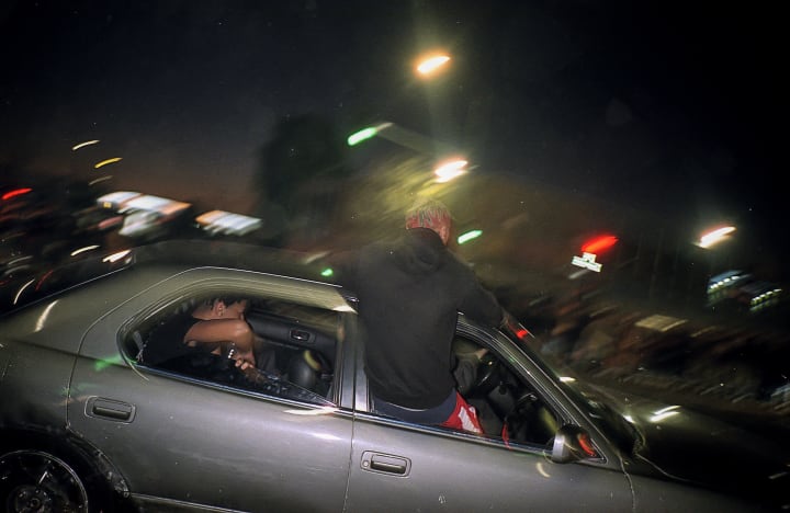 We was probably at this spot for like 35 minutes and no police yet. I figured the cops gave up, the pit went silent and there it was the sound no one wants to hear, sirens. These cops came rolling in deep over like 15 cruisers all lined up coming down the block. Everyone scattered immediately. I haven't run this fast to my car ever in my life. The roads were all flooded with cars, the first chance I got, I drove onto the sidewalk and made moves past the crowd. Hit the corner quick then back onto the road slippin in with the other cars that broke free from the crowd on a quiet side street. At this point it was 2am, which meant it was way past my bedtime.