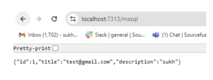 Finally, navigate to the GET URL shown below in your browser. It will insert the specified customer into the MSSQL database, retrieve the most recently inserted row, and display it as a response.