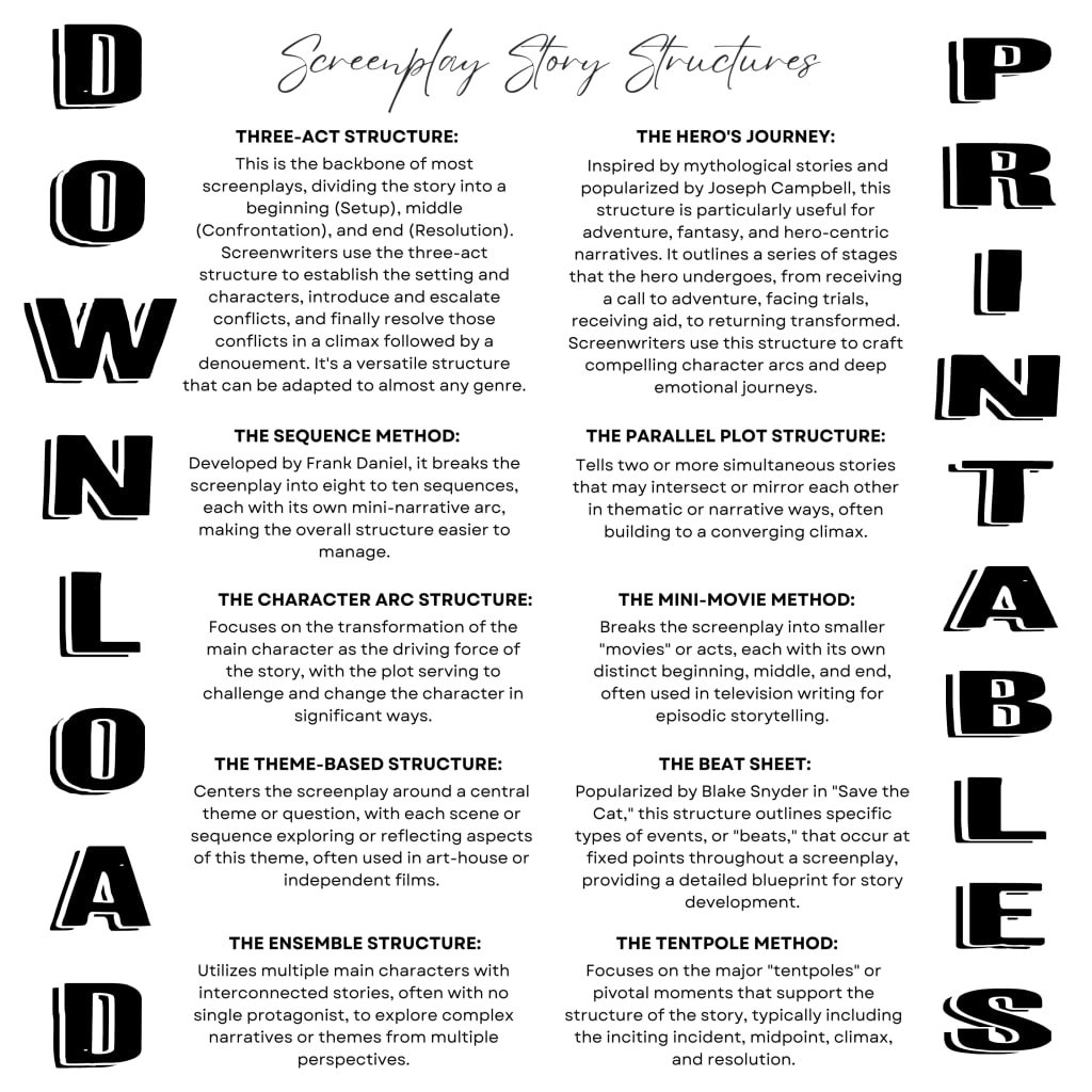 Inspired by mythological stories and popularized by Joseph Campbell, this structure is particularly useful for adventure, fantasy, and hero-centric narratives. It outlines a series of stages that the hero undergoes, from receiving a call to adventure, facing trials, receiving aid, to returning transformed. Screenwriters use this structure to craft compelling character arcs and deep emotional journeys.