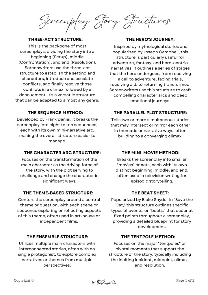 Screenplay story structures are essential frameworks that guide screenwriters in crafting compelling and cohesive narratives for films and television shows. These structures serve as blueprints, helping writers to organize their stories in a way that maximizes emotional impact, maintains pacing, and ensures a satisfying narrative arc. Understanding and effectively using these structures can significantly enhance the storytelling process, making the difference between a disjointed screenplay and a captivating cinematic experience.