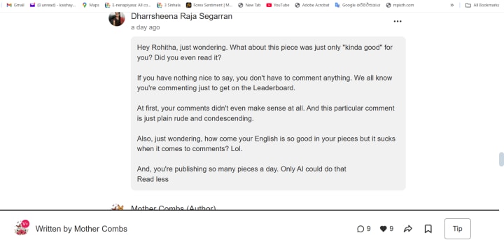 Mrs. Dharrsheena Raja, concern that arose on March 18th, 2025, regarding a comment you made on my post accusing me of using AI. You also implied that many members of the Vocal platform were aware of this, as they had seen your comment. At the time, I chose not to respond immediately because I wanted to verify the matter with a responsible team from Vocal.