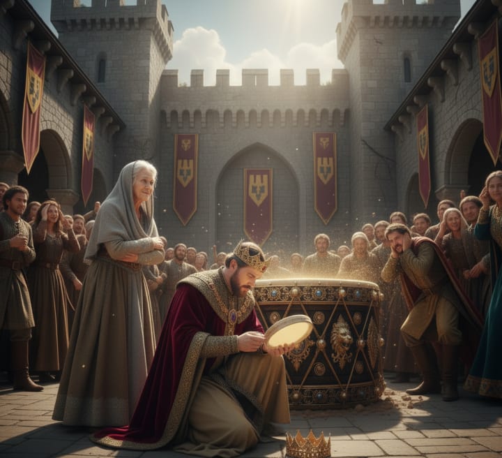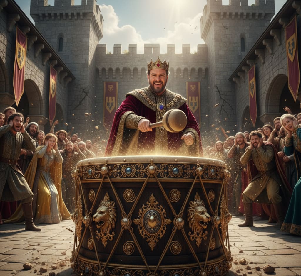 In the bustling kingdom of Eldoria, nestled between the Whisperwind Mountains and the Azure Sea, King Theron was known for his love of grand spectacles and his booming voice. But more than anything, he was known for his drum. Not just any drum, mind you, but "The King's Drum" a magnificent instrument crafted from ancient oak, adorned with shimmering gold leaf and precious stones. Its sound, when struck by the King himself, was said to resonate through every corner of the kingdom, a declaration of his power and presence.