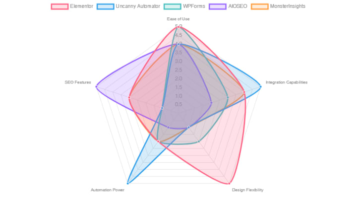 Bar chart evaluating select WordPress no-code tools based on their beginner-friendliness, advanced features, community support, cost-effectiveness, and performance impact.