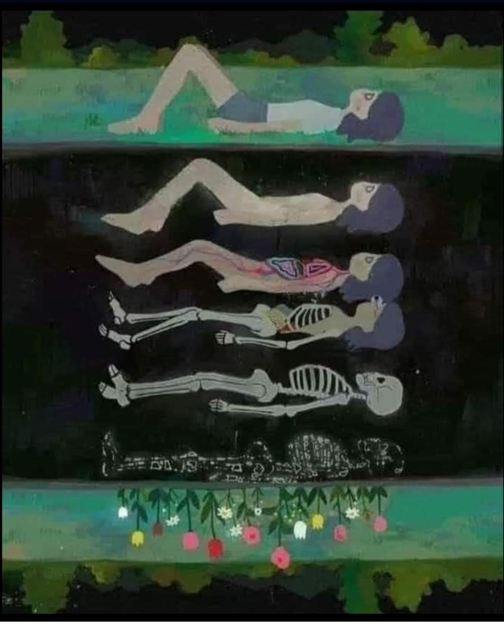 You are dusted with recycled butterflies, plants, rocks, streams, firewood, wolf skins and shark teeth chopped up into bits so small they couldn't be smaller, and put back together as the most complex thing living on our planet.